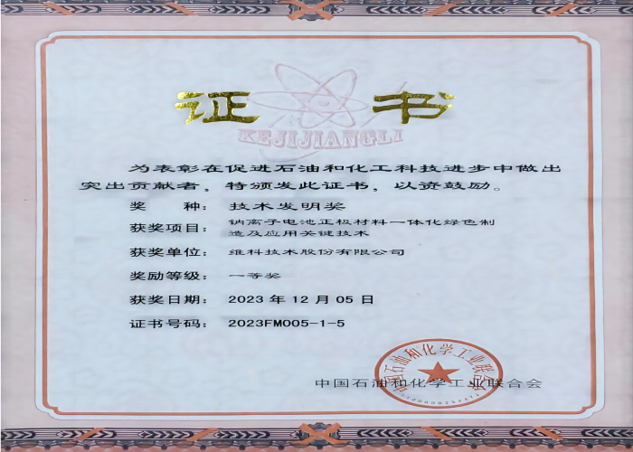 この大會では、2023年度の中國石油化學(xué)工業(yè)分野の科學(xué)技術(shù)革新で受賞した団體と個人が表彰されました。維科技術(shù)は中國石油化學(xué)工業(yè)連合會の技術(shù)発明賞一等賞を受賞し、また、上海交通大學(xué)の馬紫峰教授が特別報告を行い、ナトリウムイオン電池技術(shù)の発展の機(jī)會と産業(yè)化の挑戦について紹介しました。この報告は出席した代表者から高い関心を集めました。